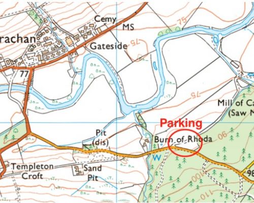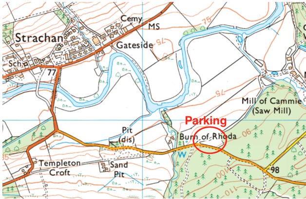 Parking is available on a small field at ///contrived.racing.residual. Follow the road from Strachan south to Fettercairn (B974) then left to Stonehaven (A957). After 0.5 miles the parking field is on the left.